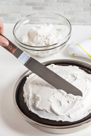 This offset, angled blade allows even flexibility and ideal distance from the surface you are working on. The wooden handle provides comfortable use and easy gripping in either hand. Great for spreading batter in a cake pan or frosting the top of a cake with ease.